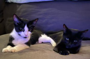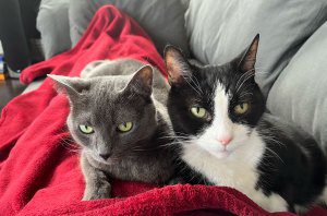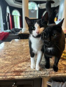 “My assistant showed me me a picture of a cat – it kind of had Meowingtons’ patterns, but it was a girl, and I’m like, ‘OK, you know what? I can stomach that,’” he recalls of considering a kitty who looked similar to but didn’t have the exact same markings as his beloved late cat. And off to the shelter he went to check out the potential new feline family member. “I went and saw the one, and they were like, ‘Oh, and this is her sister,’ and they were like, ‘You couldn’t separate them without a fight or a vocalization of sorts from either cat … they’re a bonded pair.’ All right, here we go! I guess we’re getting two cats!”