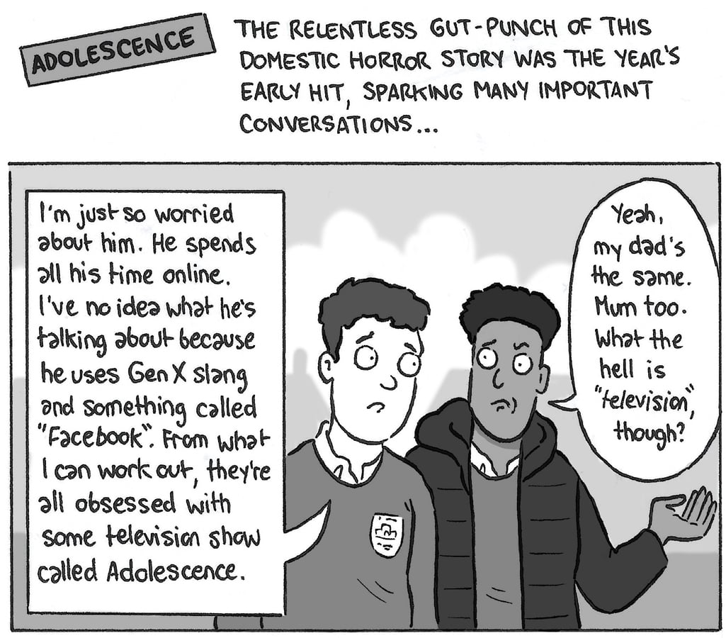 Thankfully, we have plenty of opportunities to do so this year, with Far Out giving you the rundown of the best and worst moments of the year. But we also have our very own cartoonist, David Squires, to pitch in and provide his favourite TV moments of the year.